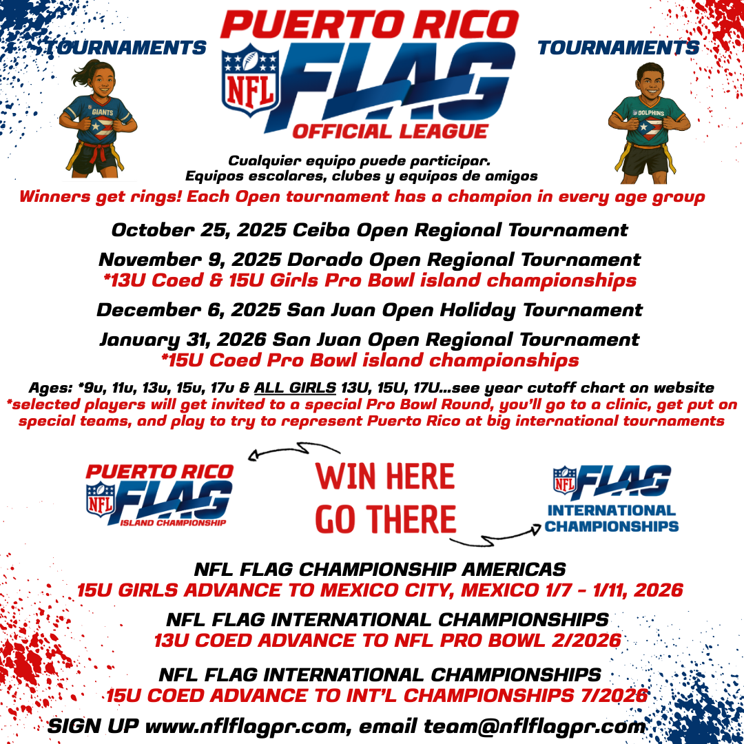 ¡Nos emociona ofrecer a nuestros atletas la oportunidad de competir a nivel internacional! Para los equipos que ganen y avancen a los NFL FLAG International Tournaments, las familias serán responsables de los gastos de viaje (como pasajes aéreos y hotel). Puerto Rico NFL FLAG proveerá los detalles exactos del viaje. ¡Gracias por su apoyo!